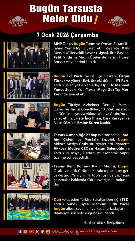 - Türkiye Alzheimer Derneği Mersin Şubesi ve Tarsus Gönüllüleri, 10 Ocak Gazeteciler Günü dolayısıyla Akkoza Medya Grubu’nu ziyaret etti. Ziyarete İnci İlhan, Esra Karayel ve Basın Sözcüsü Emine Kuren katıldı.