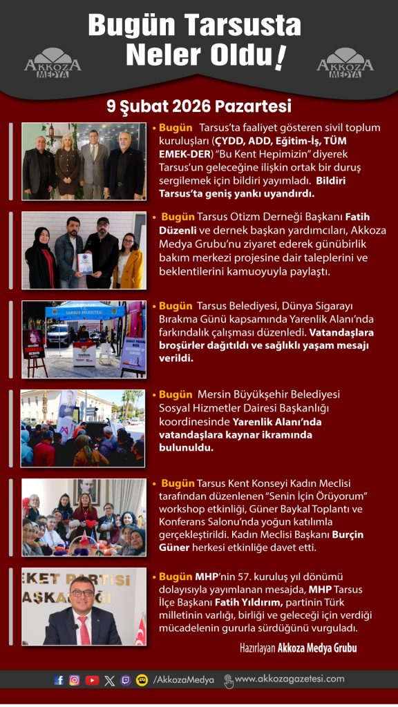 Ana Sayfa Bugün Tarsus'ta Neler Oldu, Tarsus, Tarsus Haberleri 9 Şubat 2026 1098 Görüntüleme
