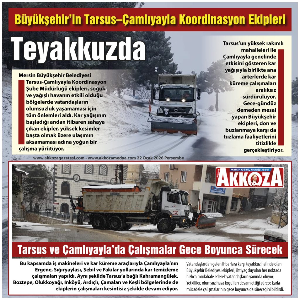 Mersin Büyükşehir Belediyesi Tarsus-Çamlıyayla Koordinasyon Şube Müdürlüğü ekipleri, soğuk ve yağışlı havanın etkili olduğu bölgelerde vatandaşların olumsuzluk yaşamaması için tüm önlemleri aldı. Kar yağışının başladığı andan itibaren sahaya çıkan ekipler, yüksek kesimler başta olmak üzere ulaşımın aksamaması adına yoğun bir çalışma yürütüyor.