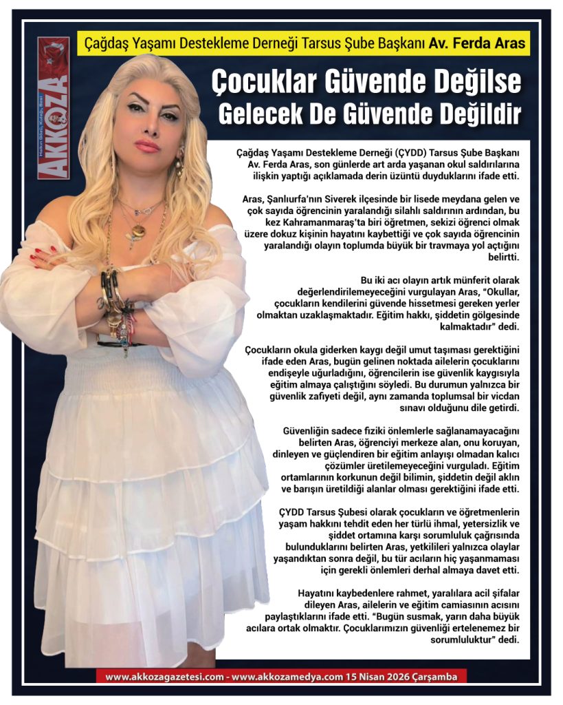 Çağdaş Yaşamı Destekleme Derneği (ÇYDD) Tarsus Şube Başkanı Av. Ferda Aras, son günlerde art arda yaşanan okul saldırılarına ilişkin yaptığı açıklamada derin üzüntü duyduklarını ifade etti.