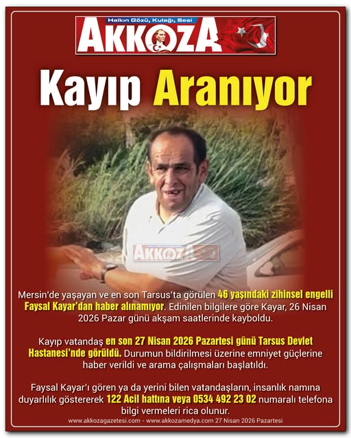 Mersin’de yaşayan ve en son Tarsus’ta görülen 46 yaşındaki zihinsel engelli Faysal Kayar’dan haber alınamıyor. Edinilen bilgilere göre Kayar, 26 Nisan 2026 Pazar günü akşam saatlerinde kayboldu.