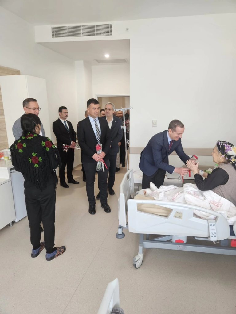 Kaymakam Akyüz ve beraberindeki heyet, hastane servislerini gezerek sağlık çalışanlarının bayramını tebrik etti, fedakârca yürüttükleri görevlerinden dolayı teşekkürlerini iletti. Hastalar ve yakınlarıyla da yakından ilgilenen heyet, geçmiş olsun dileklerini ileterek bayramlarını kutladı.