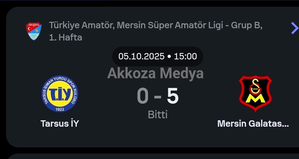 05 Ekim 2025 Pazar – Mersin Süper Amatör Lig B Grubu’nun 1. haftasında Tarsus İdman Yurdu, kendi sahasında Mersin Galataspor’u konuk etti. Karşılaşma konuk ekibin 5-0 üstünlüğüyle sona erdi.
