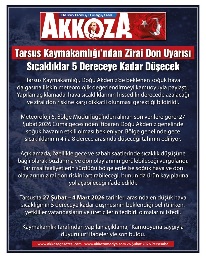 Tarsus’ta 27 Şubat – 4 Mart 2026 tarihleri arasında en düşük hava sıcaklığının 5 dereceye kadar düşmesinin beklendiği belirtilirken, yetkililer vatandaşların ve üreticilerin tedbirli olmalarını istedi.