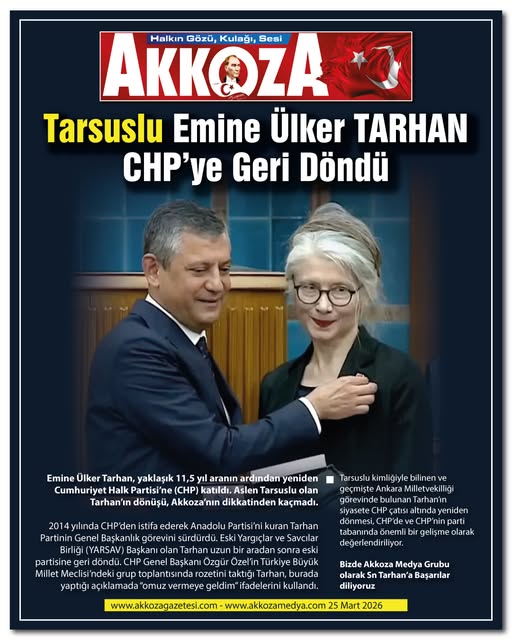 Emine Ülker Tarhan, yaklaşık 11,5 yıl aranın ardından yeniden Cumhuriyet Halk Partisi’ne (CHP) katıldı. Aslen Tarsuslu olan Tarhan’ın dönüşü, Akkoza’nın dikkatinden kaçmadı.