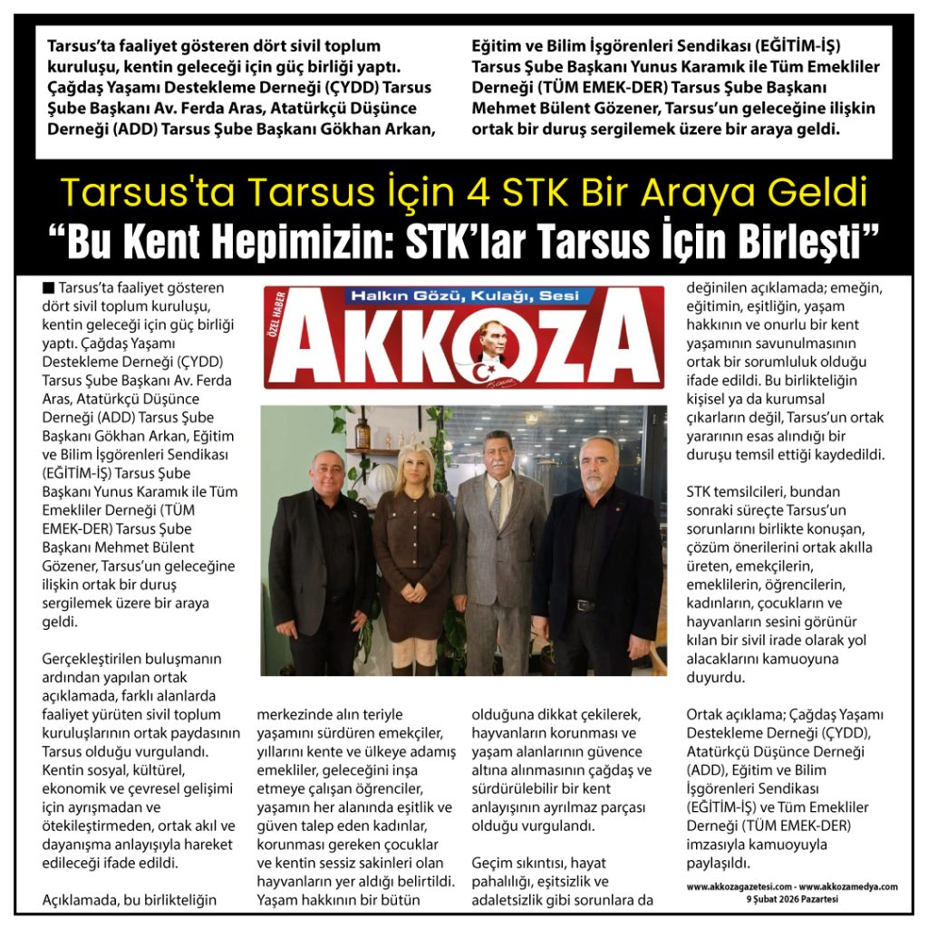 Tarsus’ta faaliyet gösteren dört sivil toplum kuruluşu, kentin geleceği için güç birliği yaptı. Çağdaş Yaşamı Destekleme Derneği (ÇYDD) Tarsus Şube Başkanı Av. Ferda Aras, Atatürkçü Düşünce Derneği (ADD) Tarsus Şube Başkanı Gökhan Arkan, Eğitim ve Bilim İşgörenleri Sendikası (EĞİTİM-İŞ) Tarsus Şube Başkanı Yunus Karamık ile Tüm Emekliler Derneği (TÜM EMEK-DER) Tarsus Şube Başkanı Mehmet Bülent Gözener, Tarsus’un geleceğine ilişkin ortak bir duruş sergilemek üzere bir araya geldi.